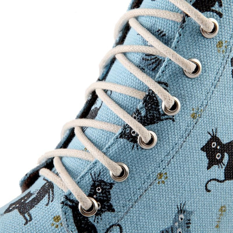 Lace up in style with this purrrfectly adorable cat printed boots! We're obsessed! Mid-rise ankle boot made from tough canvas fabric complete with metal eyelets and a grippy rubber sole. Available in Sky Blue and Cream, some of our favorite colors for the warmer months.