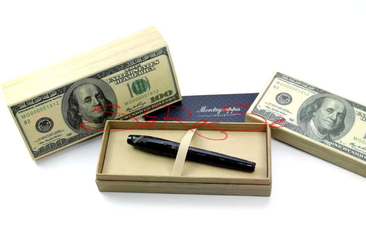 Das Schreibgerät wird in einer Box, die aussieht wie ein Stapel 100 Dollarnoten mit allen Papieren versendet.